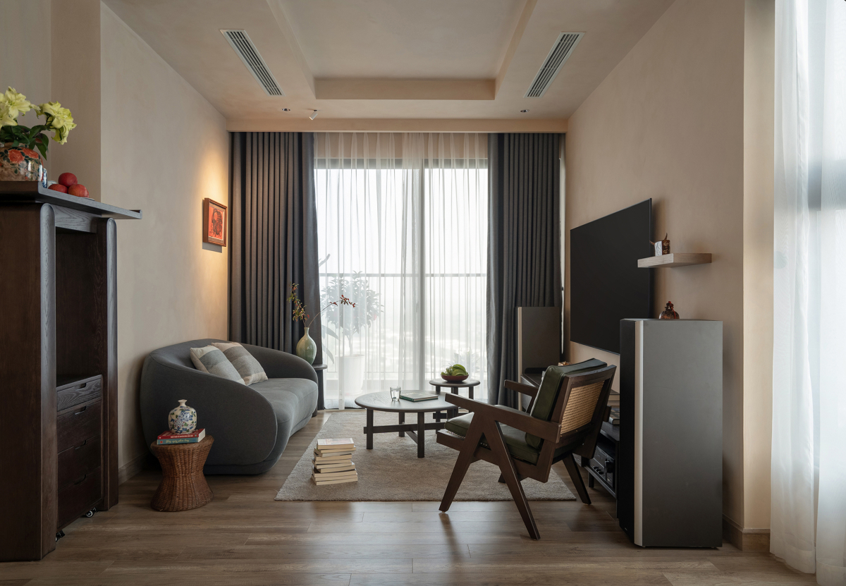 Hưng YênNội thất căn hộ lấy phong cách tối giản làm nền tảng, lồng ghép các yếu tố đặc trưng của làng quê Việt và sử dụng vật liệu tự nhiên.