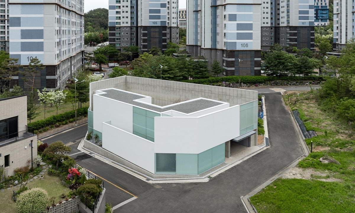 Ngôi nhà có diện tích 244 m2, nằm tại một góc khu dân cư yên tĩnh ở Daejeon (Hàn Quốc). Khu đất có ba mặt giáp đường, xung quanh là chung cư và sân golf.
