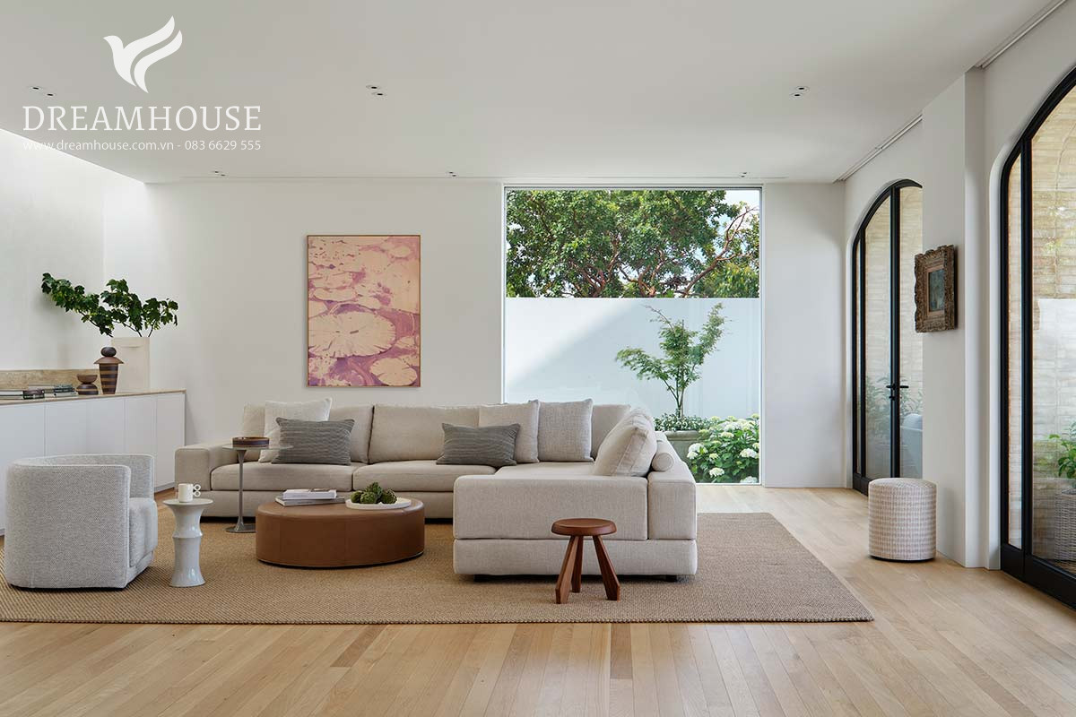 Phòng khách tối giản nổi bật với gam màu trung tính: trắng, nâu, be, đen mang lại cảm giác thoáng đãng, thư giãn cho không gian. Nội thất phong cách tối giản cũng có thiết kế đơn giản, gọn gàng và ít chi tiết.